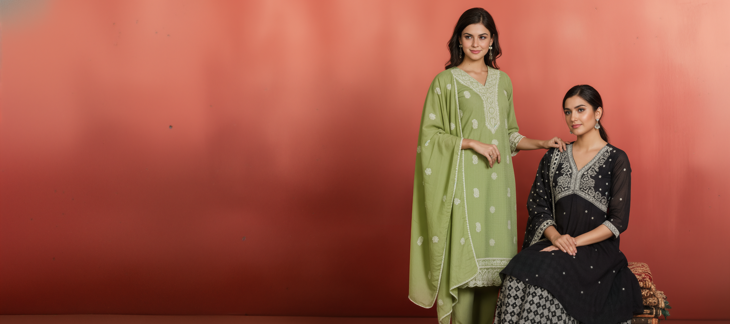 Midnight Grace A-Line Suit Set with Black & Ivory Embroidered Details with Cotton Dupatta