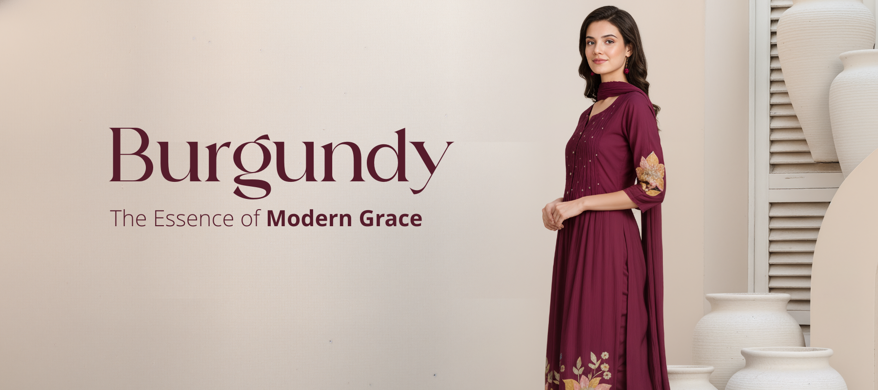 Burgundy Charm A-Line Suit Set with Multicolour Embroidered Details with Cotton Dupatta