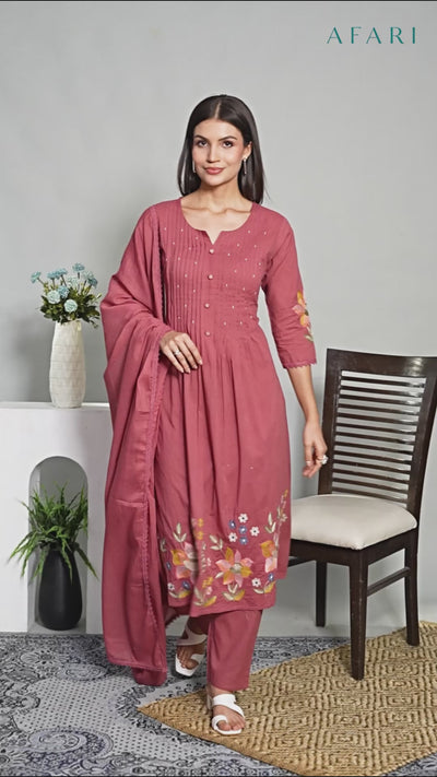 Dusty Pink Grace A-Line Suit Set with Multicolour Embroidered Details & Cotton Dupatta