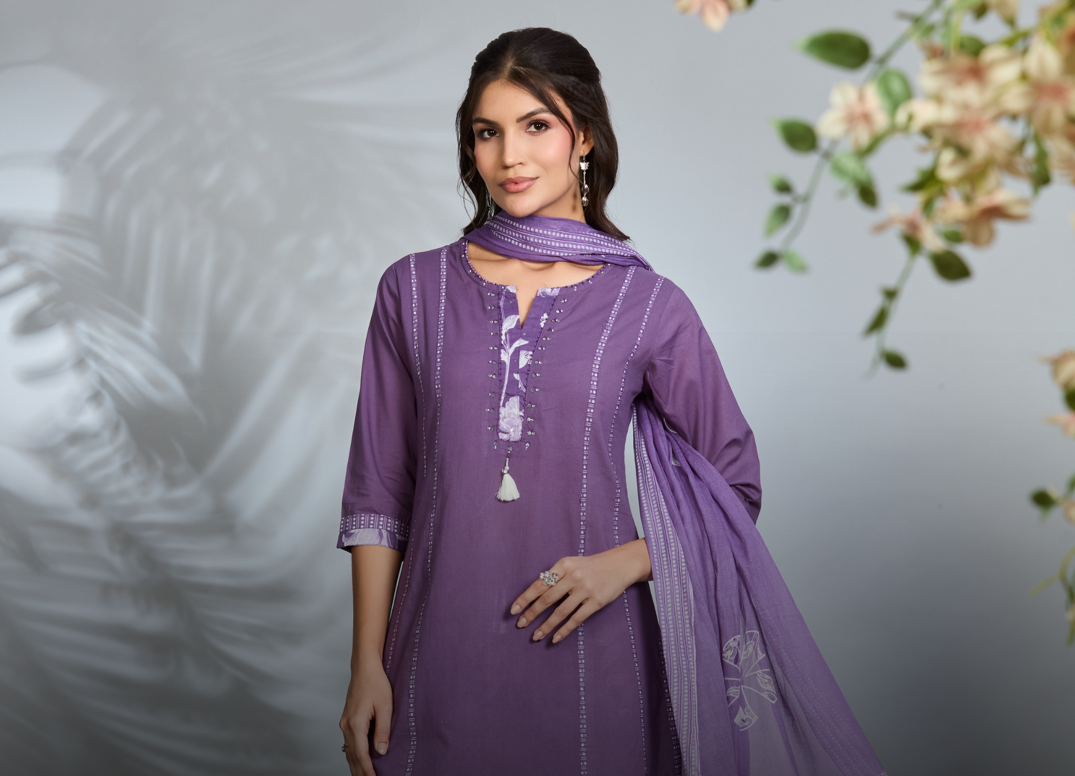 Lilac Bloom A-Line Suit Set with Ivory Base & Lilac Floral Block Prints with Cotton Dupatta