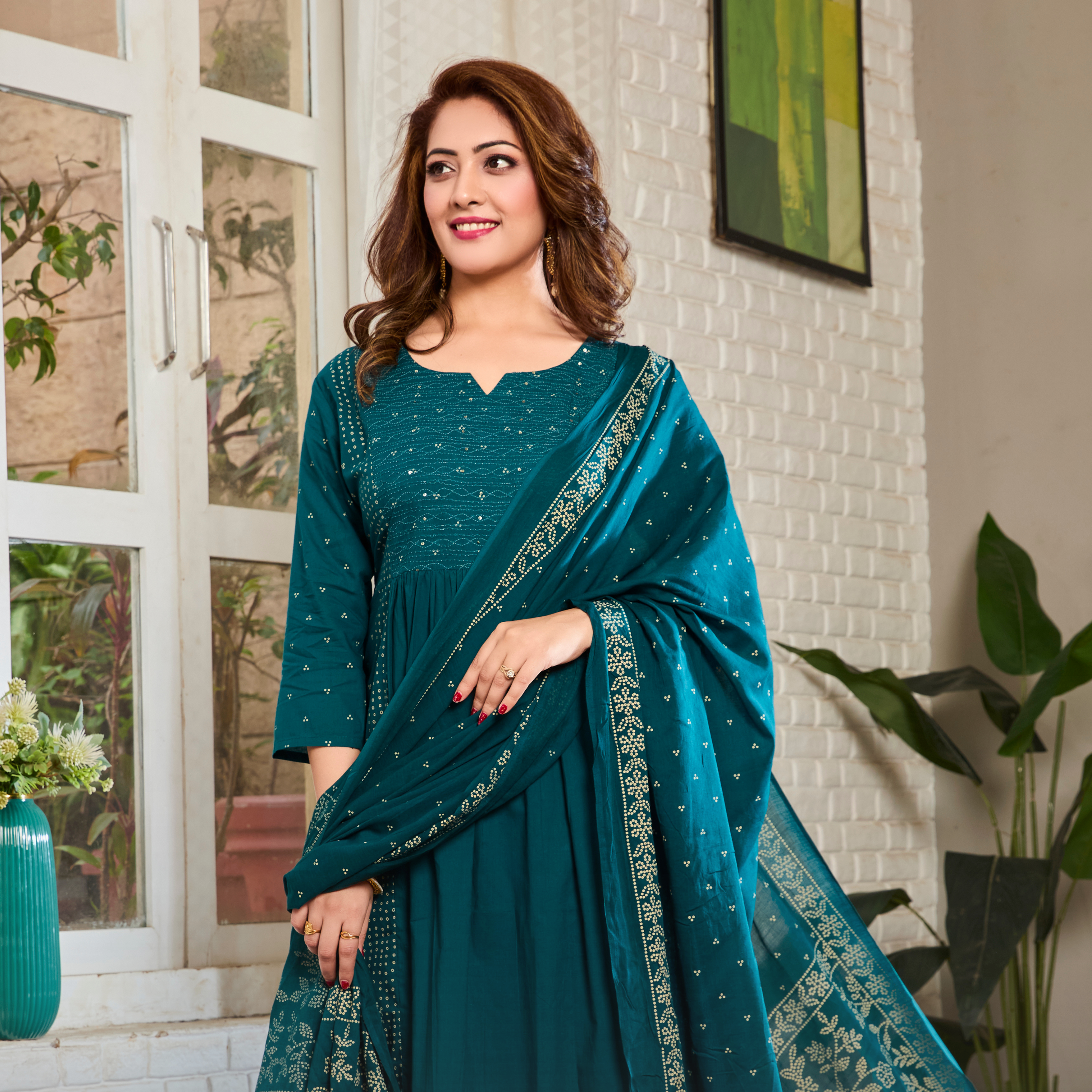 Bottoms : Solid colour Lightweight cotton dupatta with Adjustable Half-E lasticated waistband.