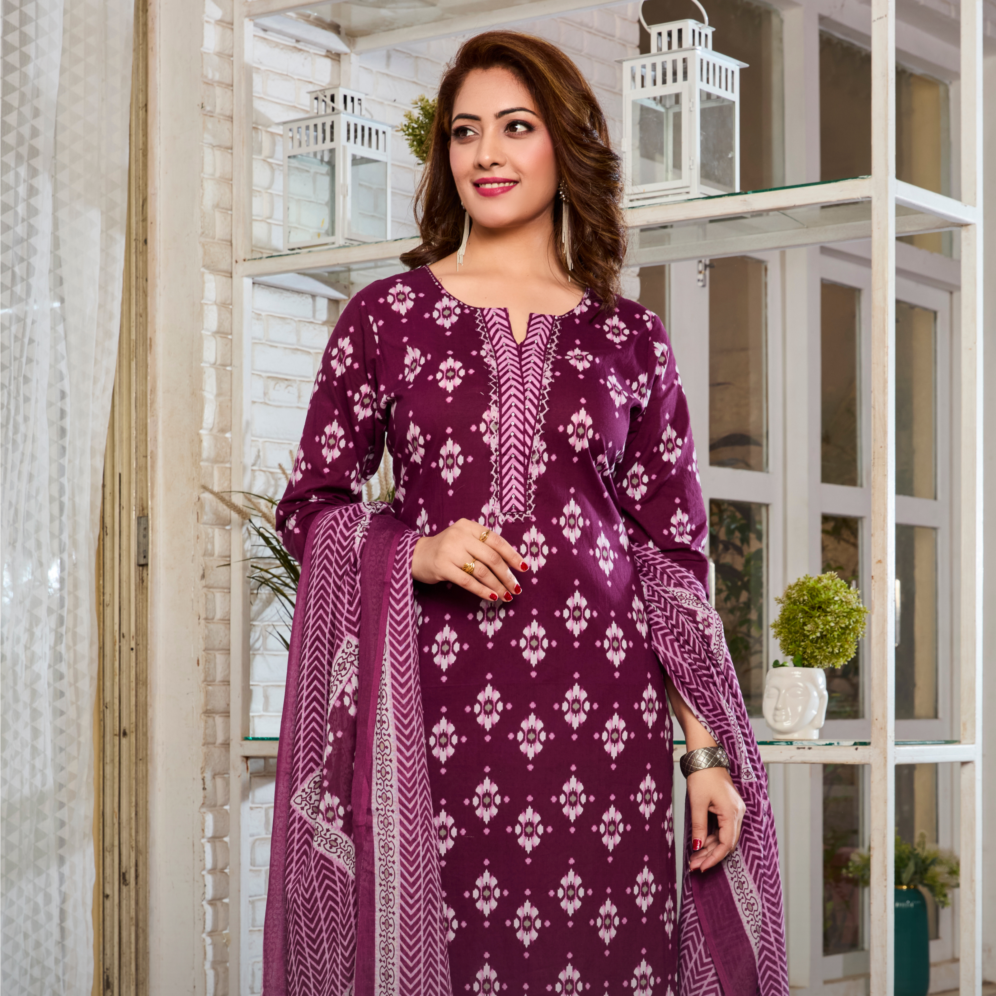 Burgundy Charm A-Line Suit Set with Multicolour Embroidered Details with Cotton Dupatta